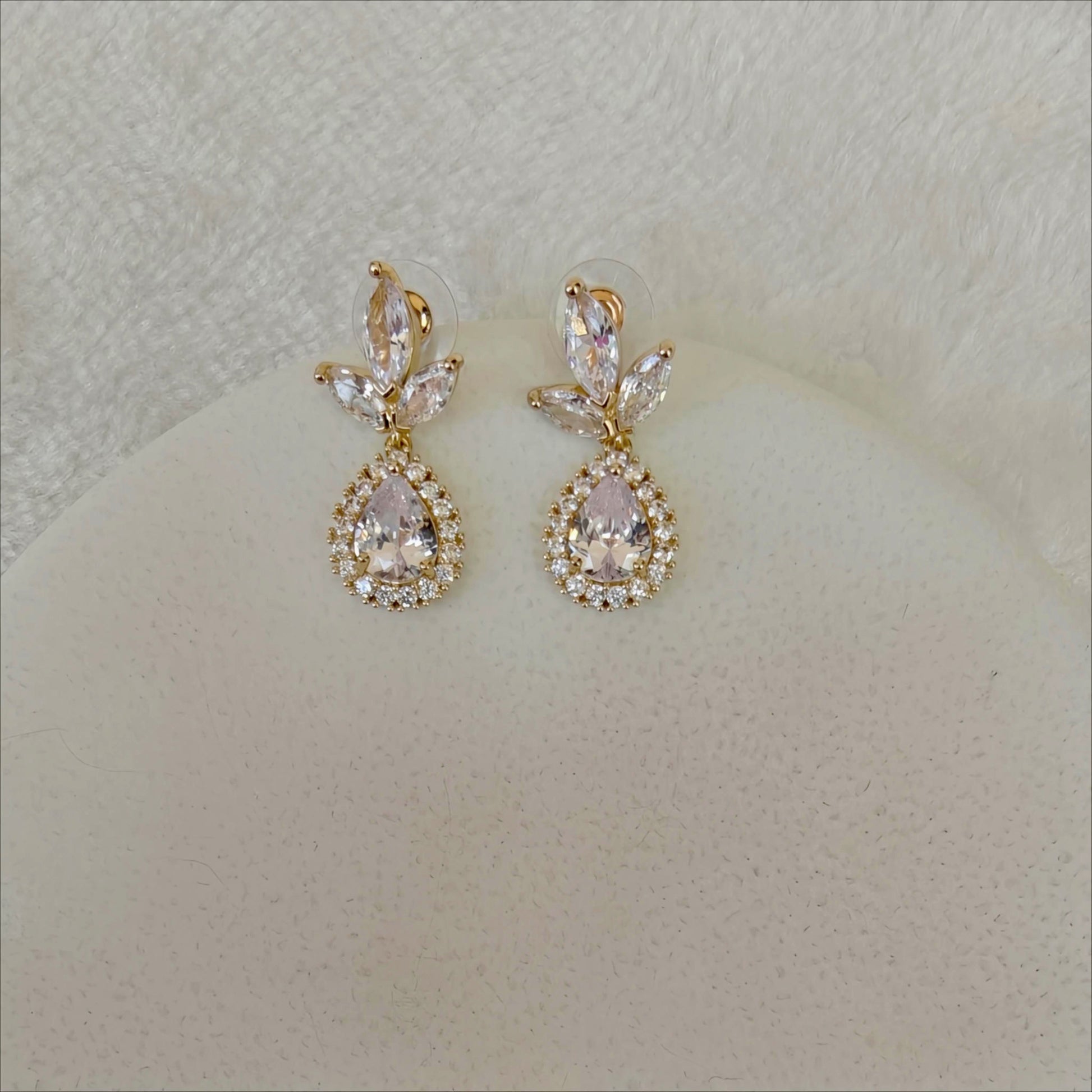 - Stones: High-quality Cubic Zirconia (CZ) - Marquise-cut stud and Pear-cut drop
