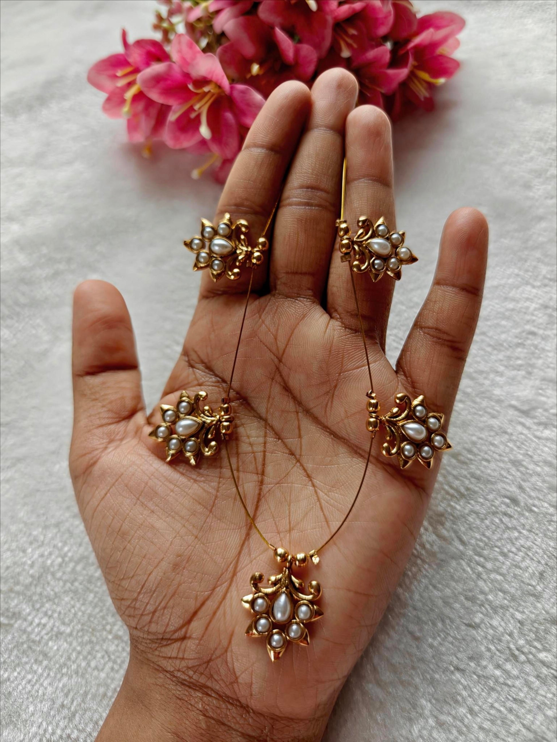 A delicate illusion necklace featuring five gold-toned, starburst-shaped pendants each accented with imitation pearls. The pendants are suspended on a fine, nearly invisible cord, making them appear to "float" across the neckline.