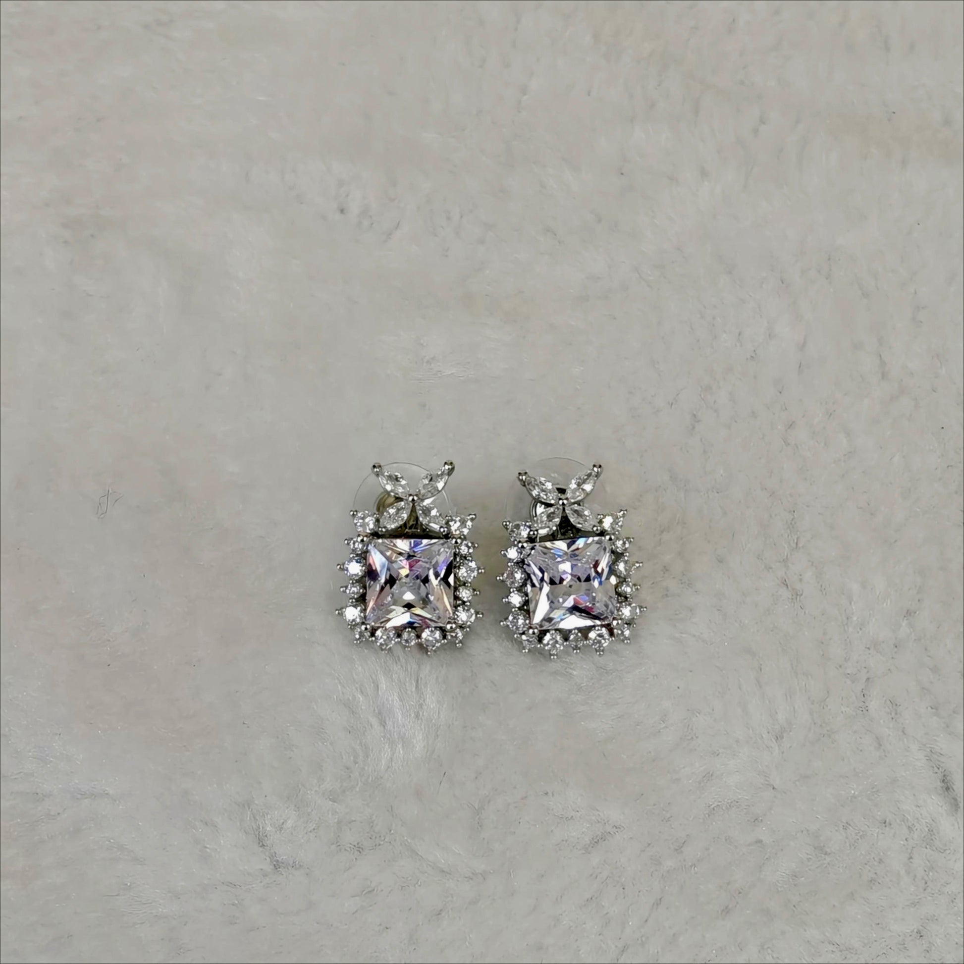 These stunning stud earrings feature a brilliant Princess Cut Cubic Zirconia center stone, expertly surrounded by a dazzling halo of smaller accent stones. Available in your choice of Lustrous Silver Tone or Warm Rose Gold Tone, they offer high-impact style for weddings, parties, or everyday luxury.