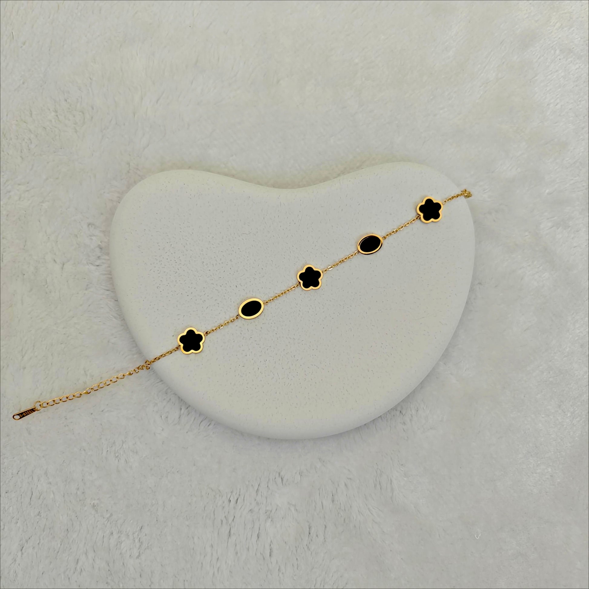This elegant chain bracelet is crafted from resilient Stainless Steel, offering maximum durability and a tarnish-free shine. It features a sophisticated, alternating sequence of black enamel motifs: classic clover shapes paired with sleek oval links. The contrast between the high-polish gold chain and the deep black enamel creates a timeless, refined look.