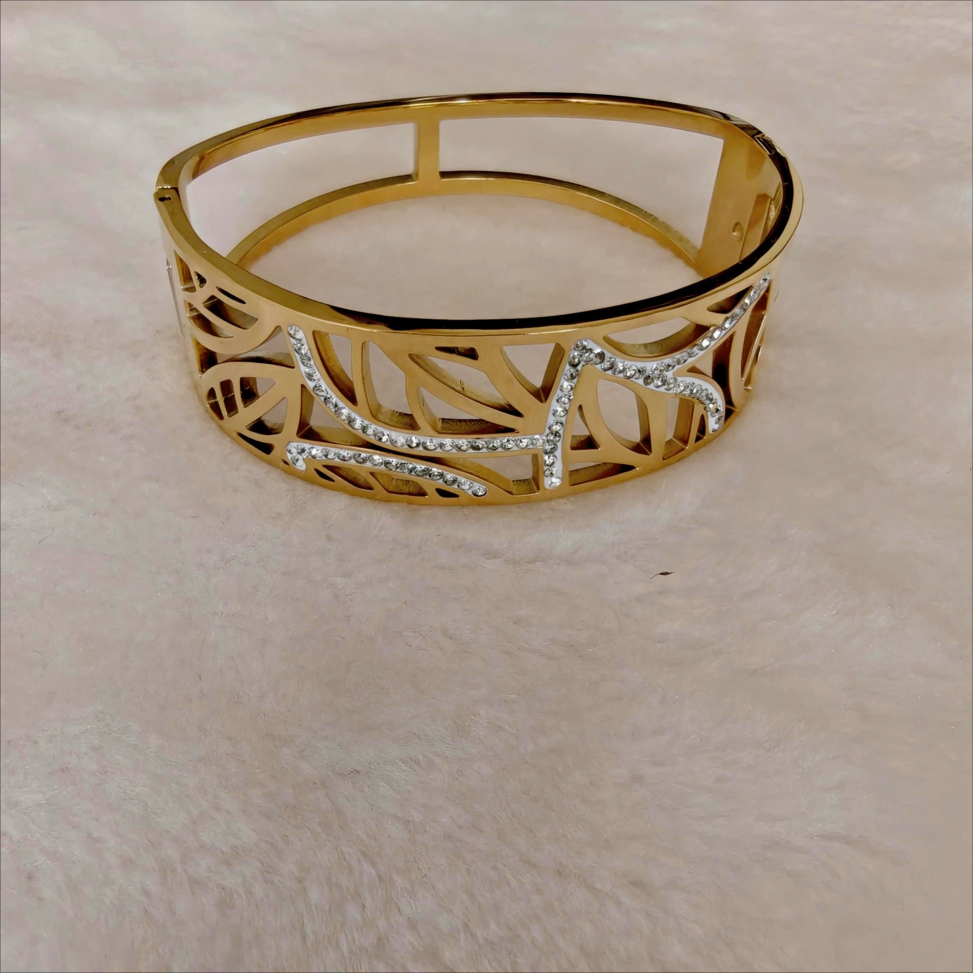 Make a statement with this bold, wide bangle crafted from resilient Stainless Steel. It features an intricate, open geometric cutout pattern, brilliantly accented by pavé-set crystals that follow the curves of the design. The luxurious gold finish and secure hinged clasp make this piece perfect for elevating any evening or special occasion look.