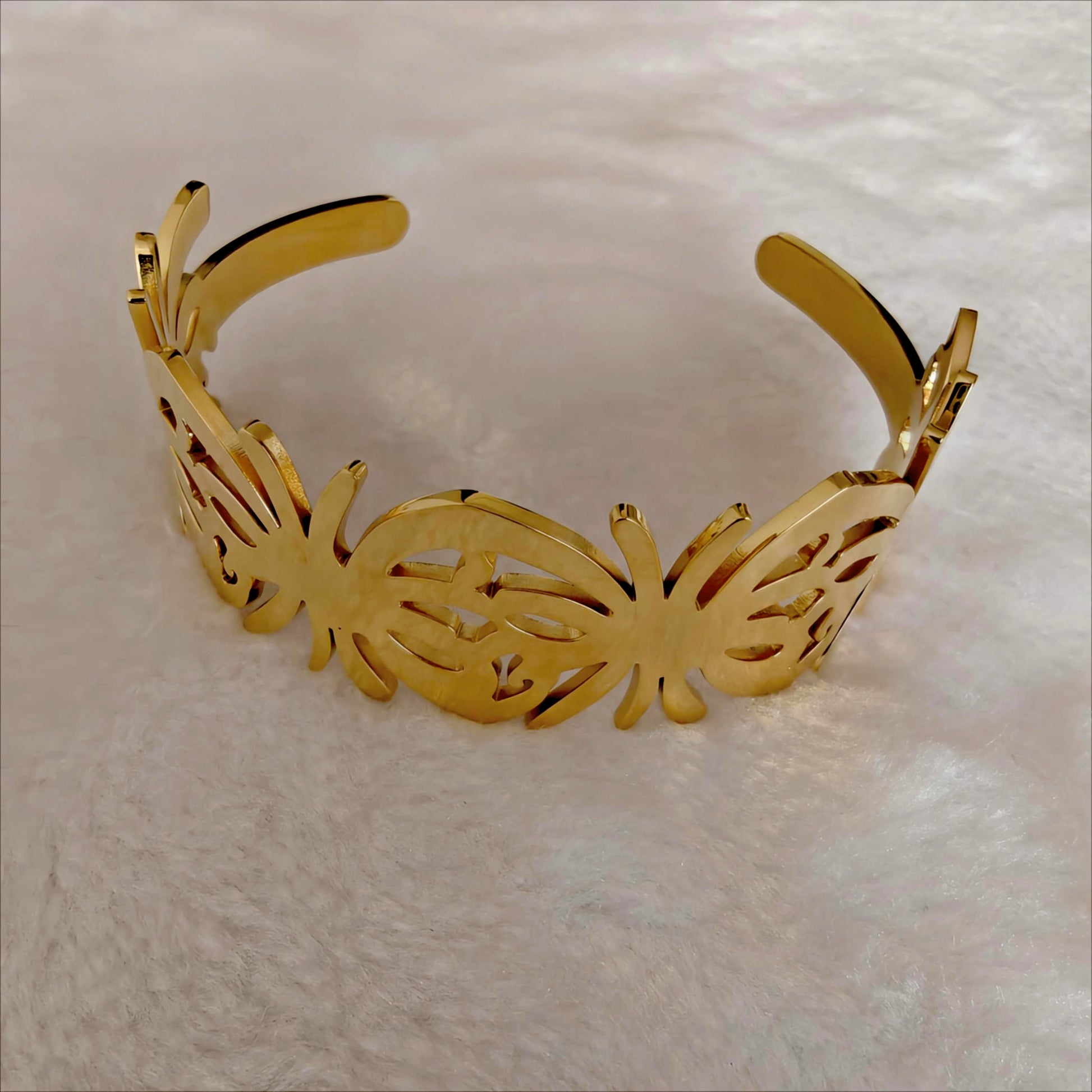This striking piece is designed to be a durable statement accessory, featuring a wide, high-polish gold-tone cuff with a delicate, continuous cutout pattern.