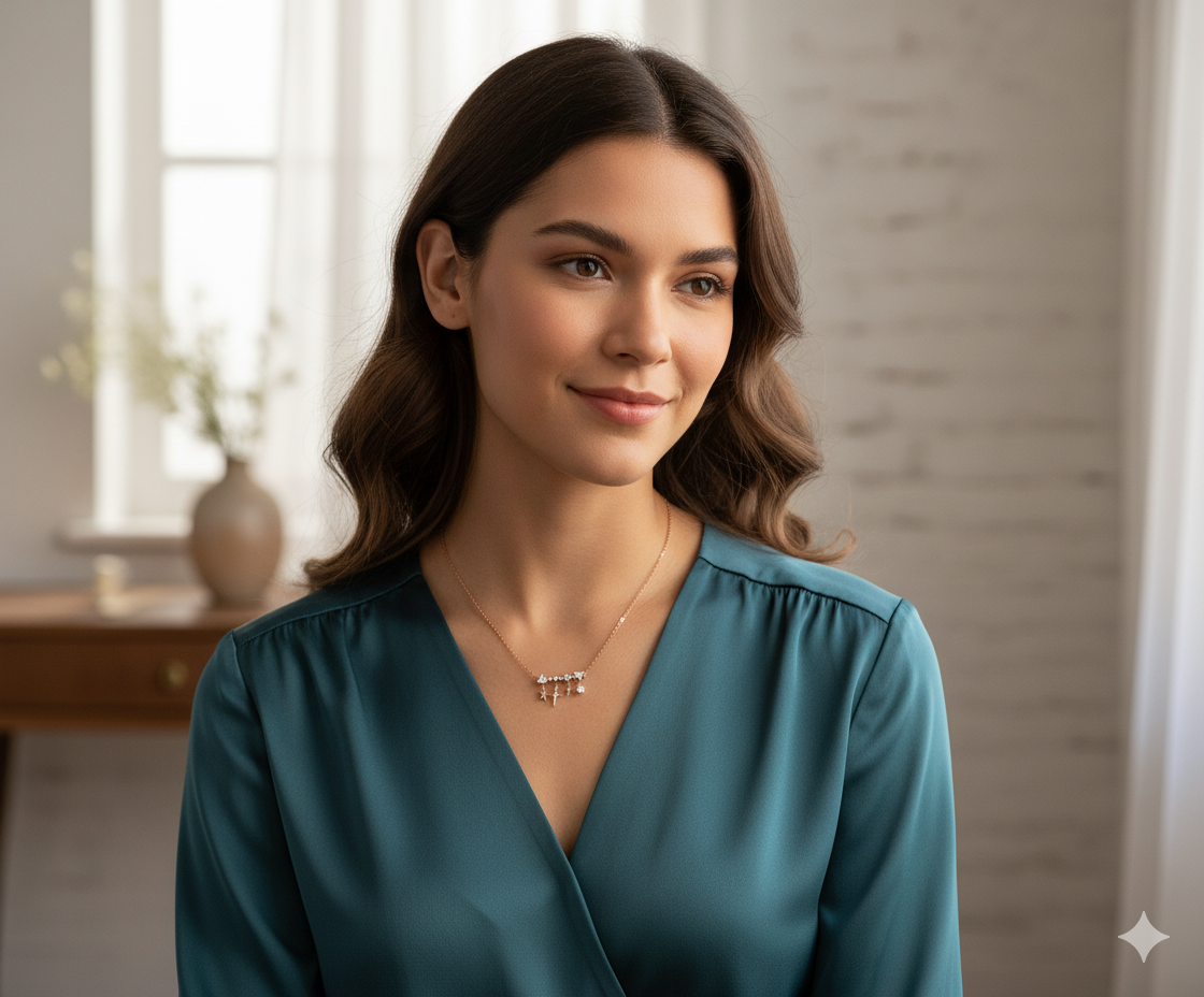 Dainty rose gold necklace featuring a celestial-themed horizontal pendant. It is adorned with multiple clear, sparkling stones and several suspended charms, including two small stars, creating a graceful, stardust-like dangle effect.